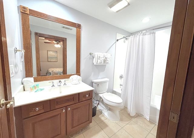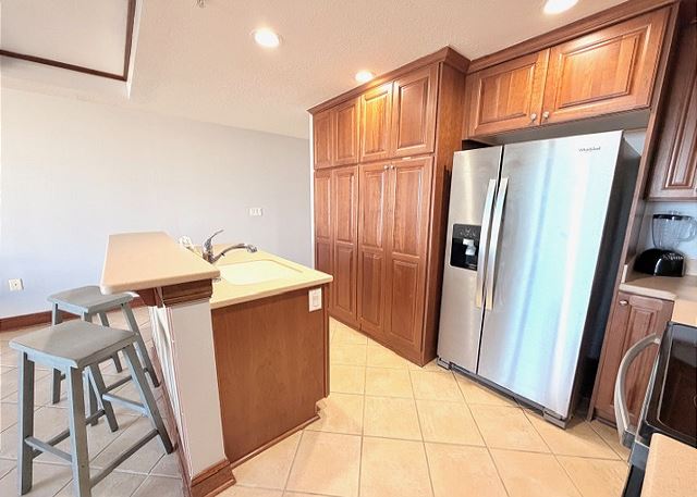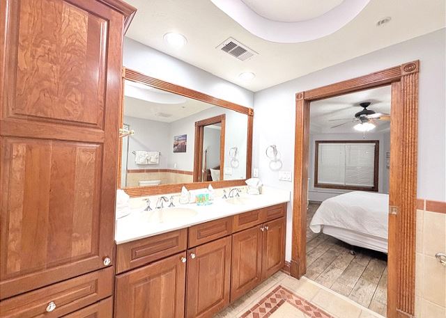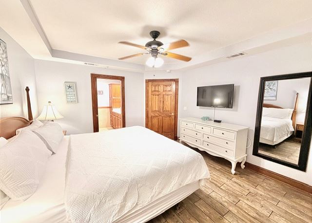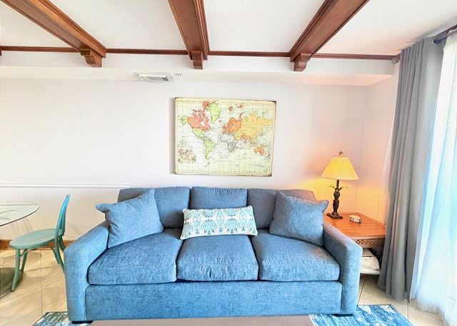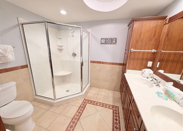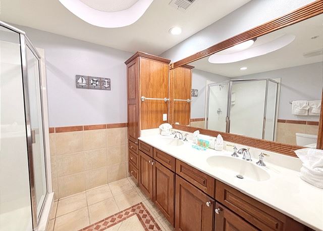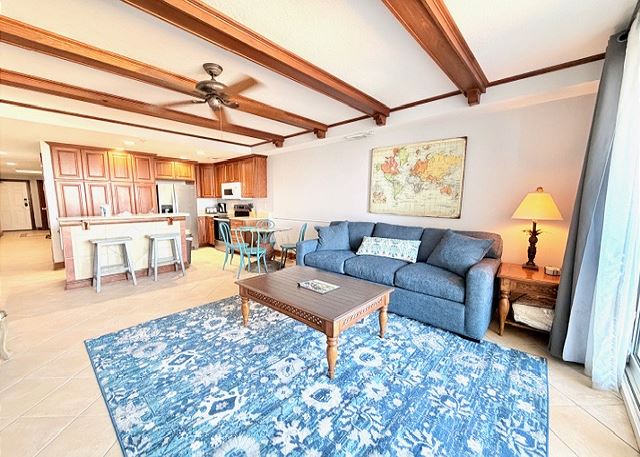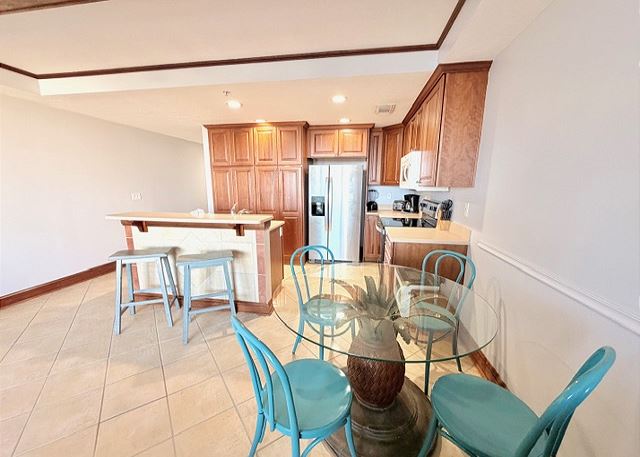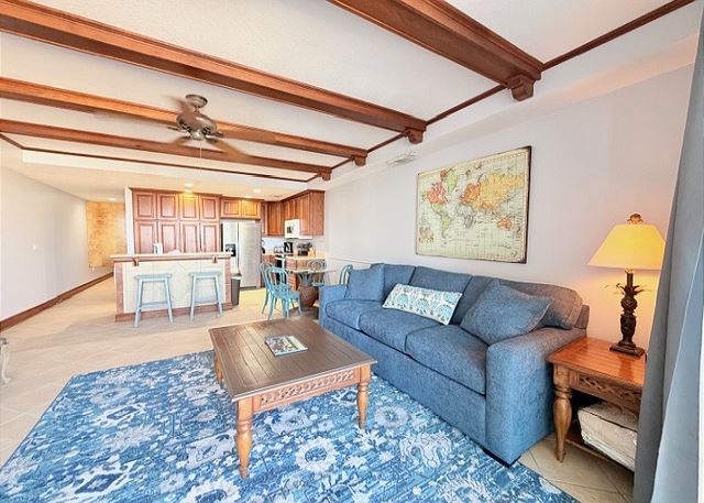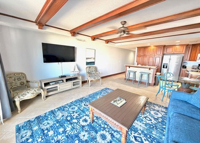 This elegant two-bedroom, two-bathroom condominium is quite simply a home away from home. The master bedroom boasts a luxurious king-sized bed and an ensuite bathroom featuring an enormous walk-in shower and double vanity. The second bedroom has a queen-sized bed and personal television, and is just steps away from the second full bathroom. The full kitchen gleams with new counter tops, hardwood cabinets and stainless-steel appliances and looks out through the cozy living area festooned in warm earth tones, to the private balcony on which you can enjoy your morning coffee or an evening cocktail as you gaze out to the ocean!