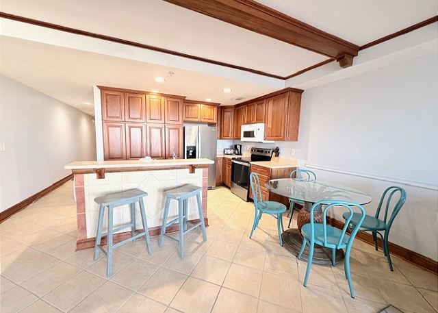This condo has an open view from the balcony of the lawn and pool area in the center of the resort. All of our condos have elevator access. Covered parking under the buildings is optional. This condo also offers washer and dryer, full kitchen with all full size appliances, linens, private WiFi connection, and cable.