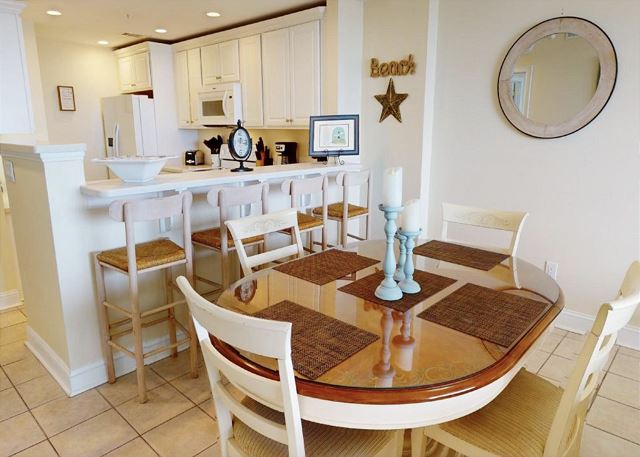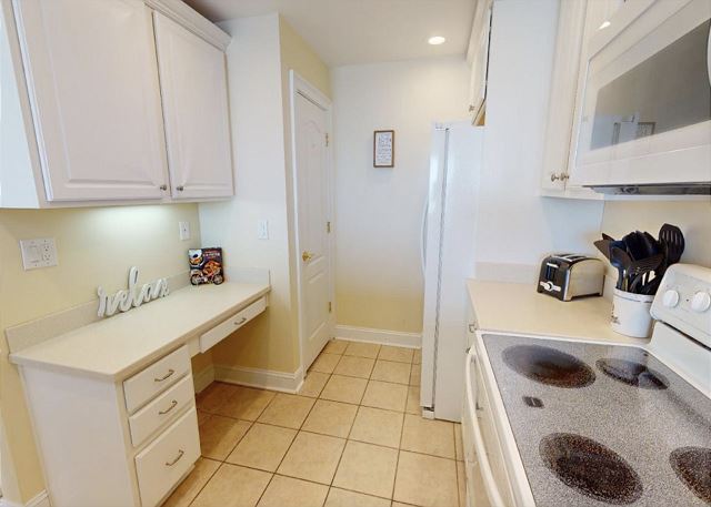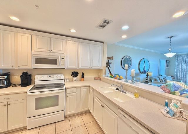 This condo has a wonderful view from the corner balcony over the dunes and out to the ocean. Perfect for viewing breezy kites, beach activity and ships in the distance. All of our condos have elevator access. Covered parking under the buildings is optional. This condo also offers washer and dryer, full kitchen with all full size appliances, linens, private WiFi connection, and cable.