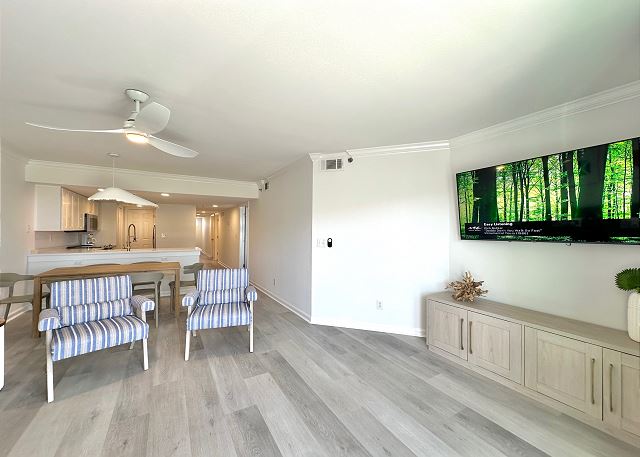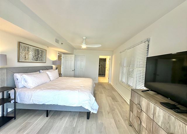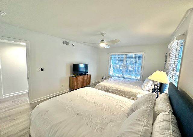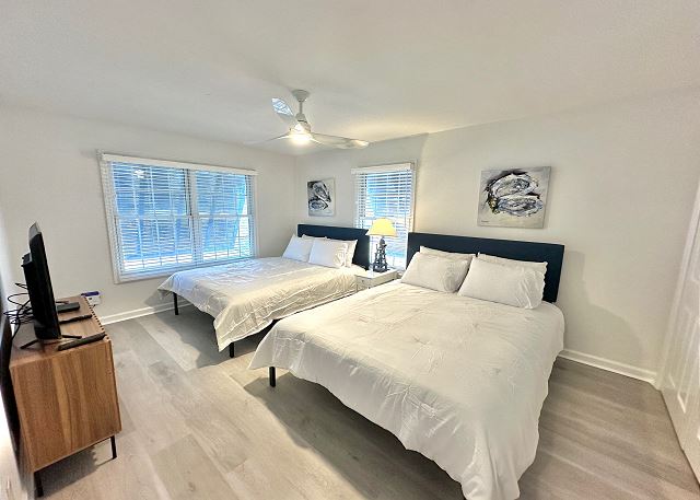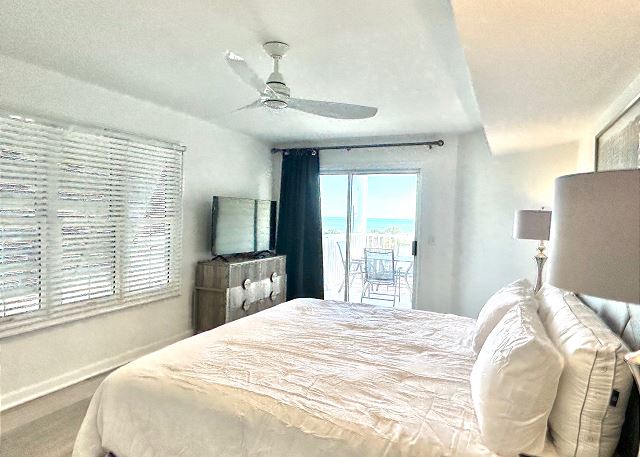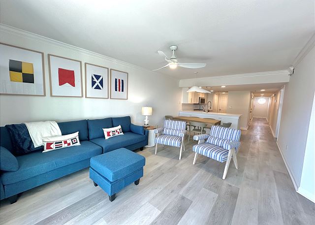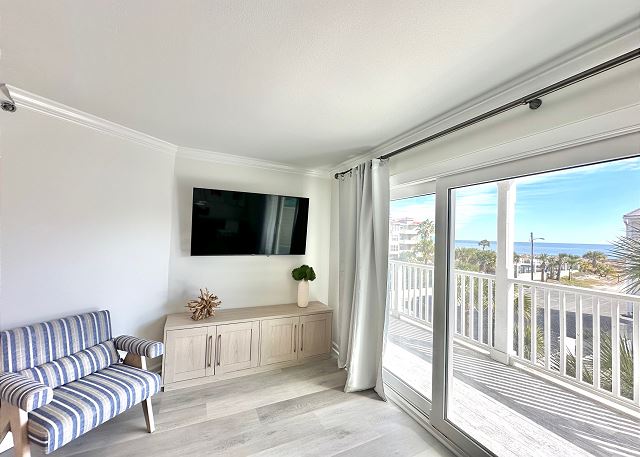 You'll be devoting full time to floating, on the sea! This whimsical three-bedroom, two-bath condo was recently remodeled, and features beachy decor from hanging ten on the waves, to hanging out underneath with a school of tropical fish! The M/B has a king-sized bed and en-suite bath, in addition to a floor-to-ceiling sliding-glass door leading out onto the L shaped balcony. The second bedroom has 2 Queen-sized beds, and the 3bedroom has 1 Queen sized bed. Respectively, they share the 2nd bathroom. All equipped with TV, WiFi cable & internet. The fully-equipped kitchen opens into the spacious living area with plenty of cozy seating for the entire family, and the sliding-glass door leading to the wrap around balcony. Though Summer Winds is located behind a townhouse, there is a great partial view of the beach from the balcony.