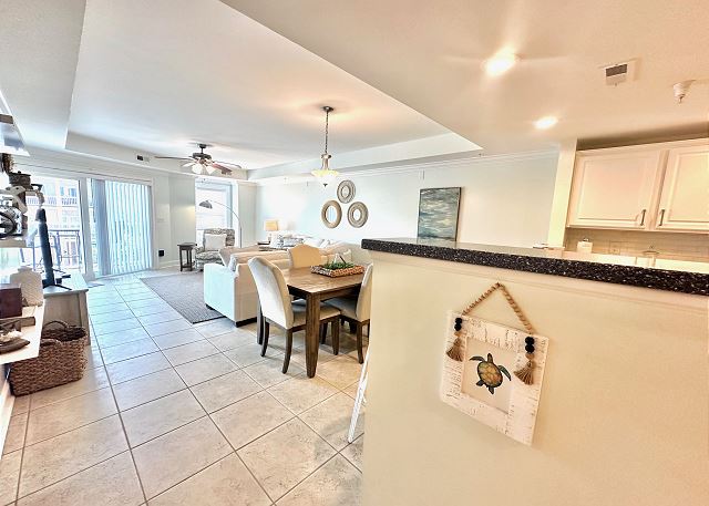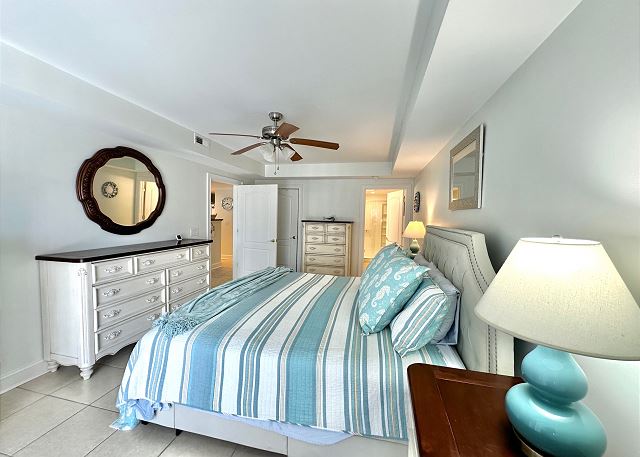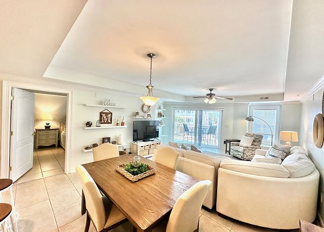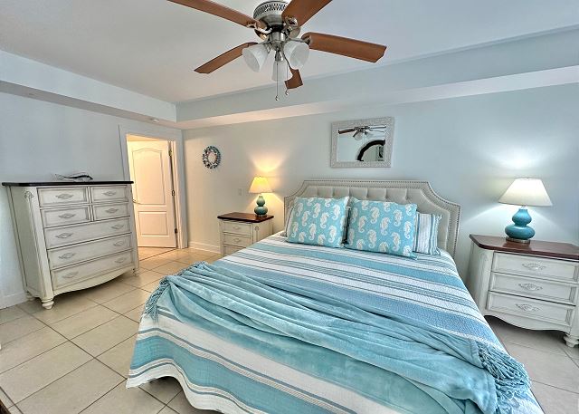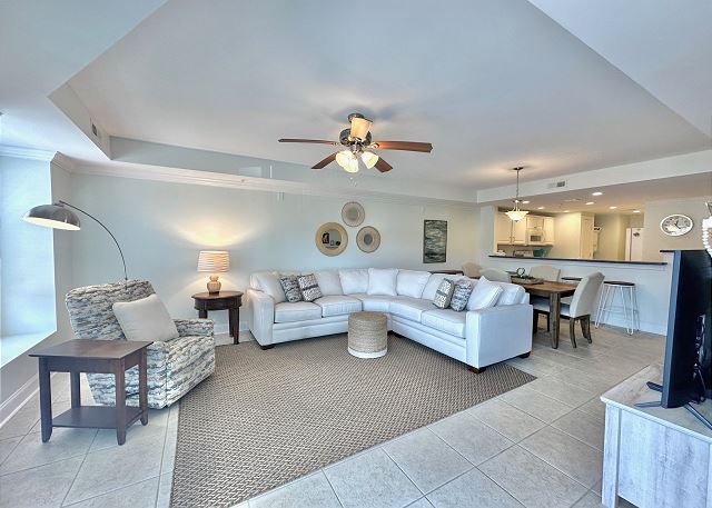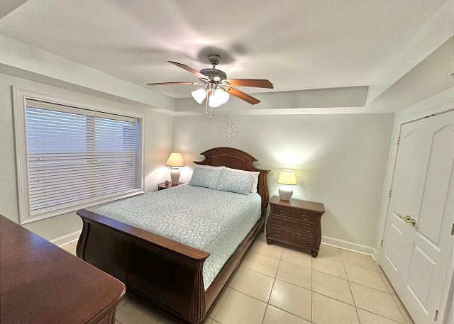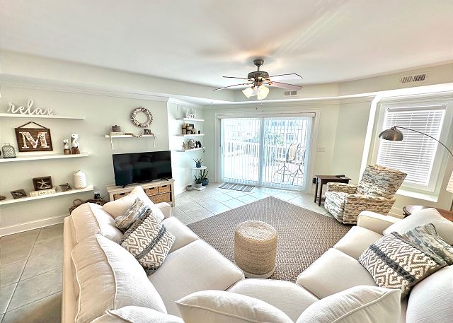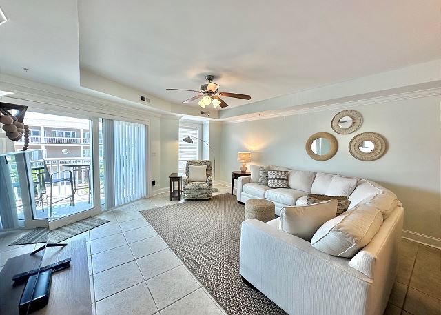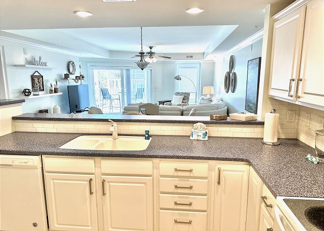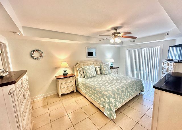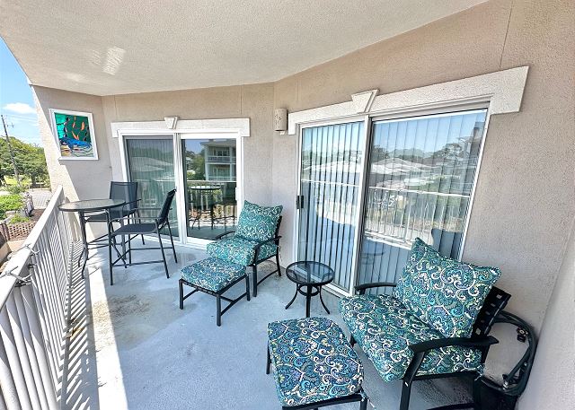 Bright sunny 2nd floor condo with 3 bedrooms and 2 baths! The master bedroom has a king sized bed and an ensuite bathroom boasting a huge walk in shower. The second bedroom has a queen bed while the third has a large day bed with a twin trundle bed. These 2 guests bedrooms share a second full bathroom. A fully stocked kitchen is separated from the spacious living room by a breakfast bar with seating for three, and a kitchen table with room for six! The living room and master bedroom has the added luxury of window seats from which to read a favorite book, or simply daydream while gazing out the window. Each bedroom is outfitted with a flat-screen TV, while the living area has both a flat-screen and a DVD player for cozy nights in. The large balcony is accessible from the living room and master bedroom, and the full-length sliding-glass doors allow the sunlight to stream in all day!