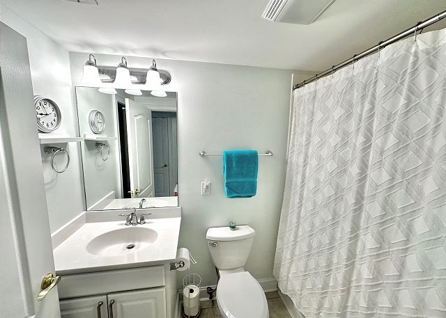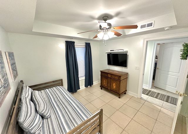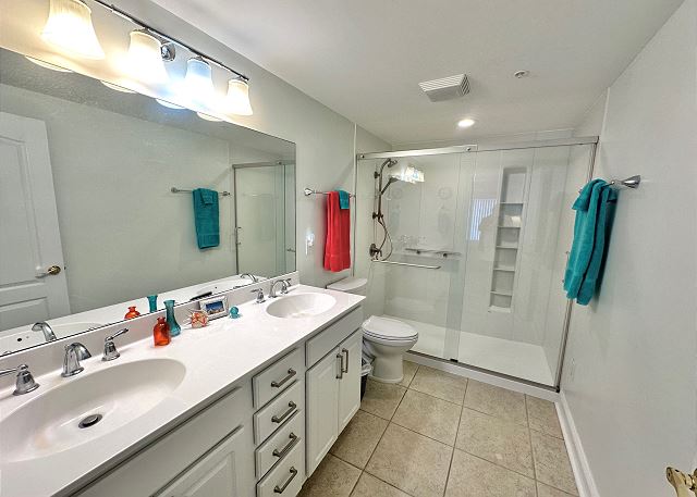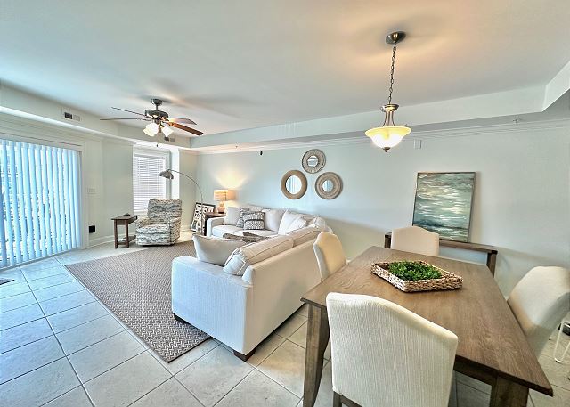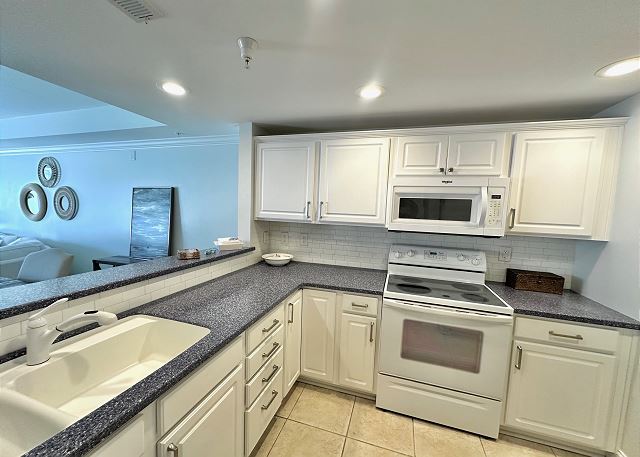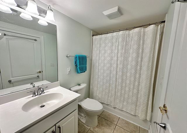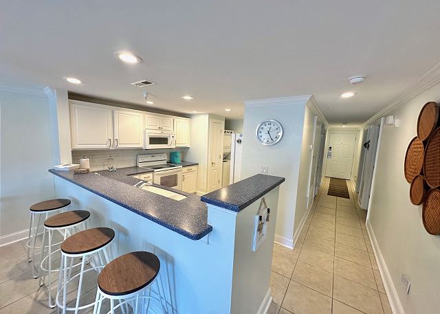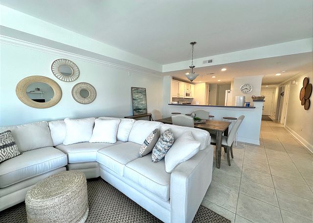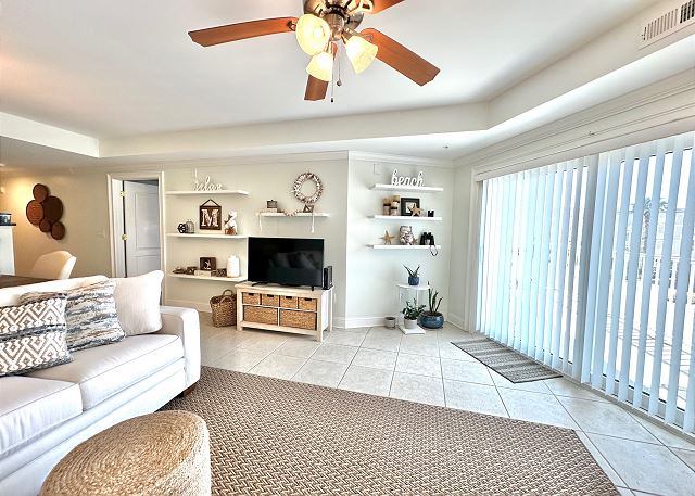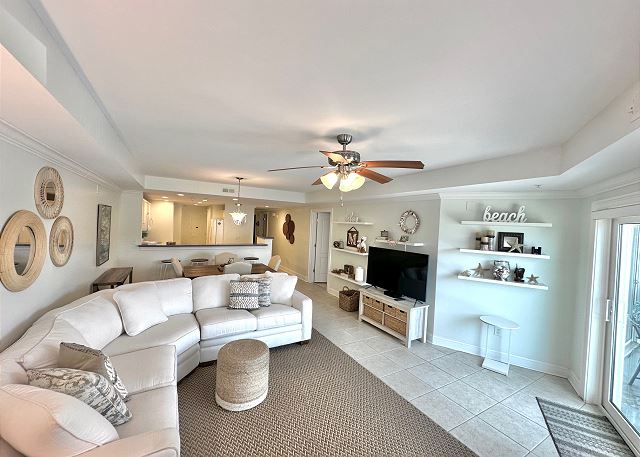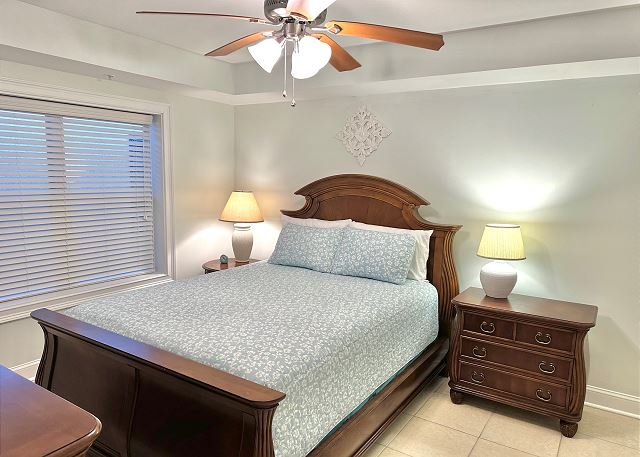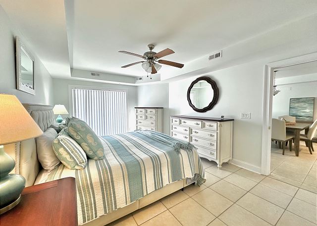 Bright sunny 2nd floor condo with 3 bedrooms and 2 baths! The master bedroom has a king sized bed and an ensuite bathroom boasting a huge walk in shower. The second bedroom has a queen bed while the third has a large day bed with a twin trundle bed. These 2 guests bedrooms share a second full bathroom. A fully stocked kitchen is separated from the spacious living room by a breakfast bar with seating for three, and a kitchen table with room for six! The living room and master bedroom has the added luxury of window seats from which to read a favorite book, or simply daydream while gazing out the window. Each bedroom is outfitted with a flat-screen TV, while the living area has both a flat-screen and a DVD player for cozy nights in. The large balcony is accessible from the living room and master bedroom, and the full-length sliding-glass doors allow the sunlight to stream in all day!